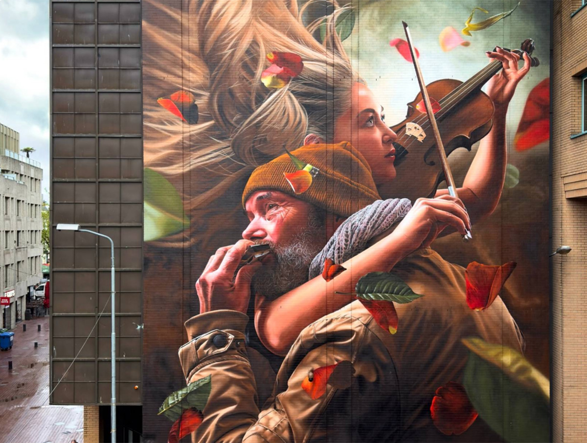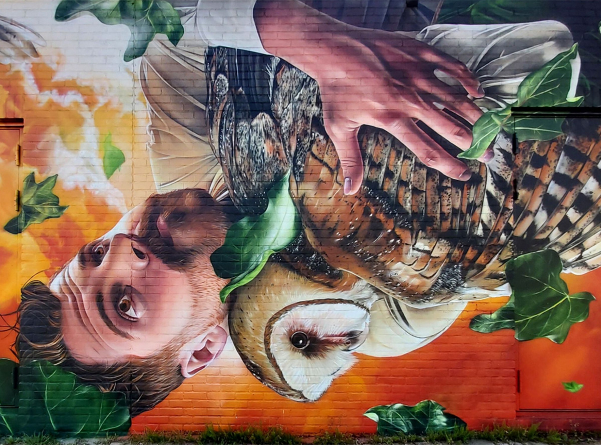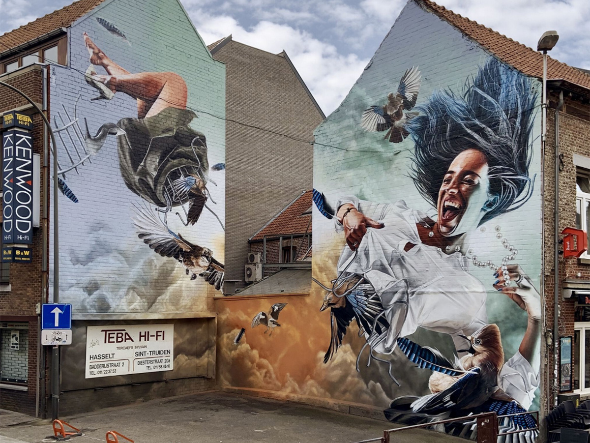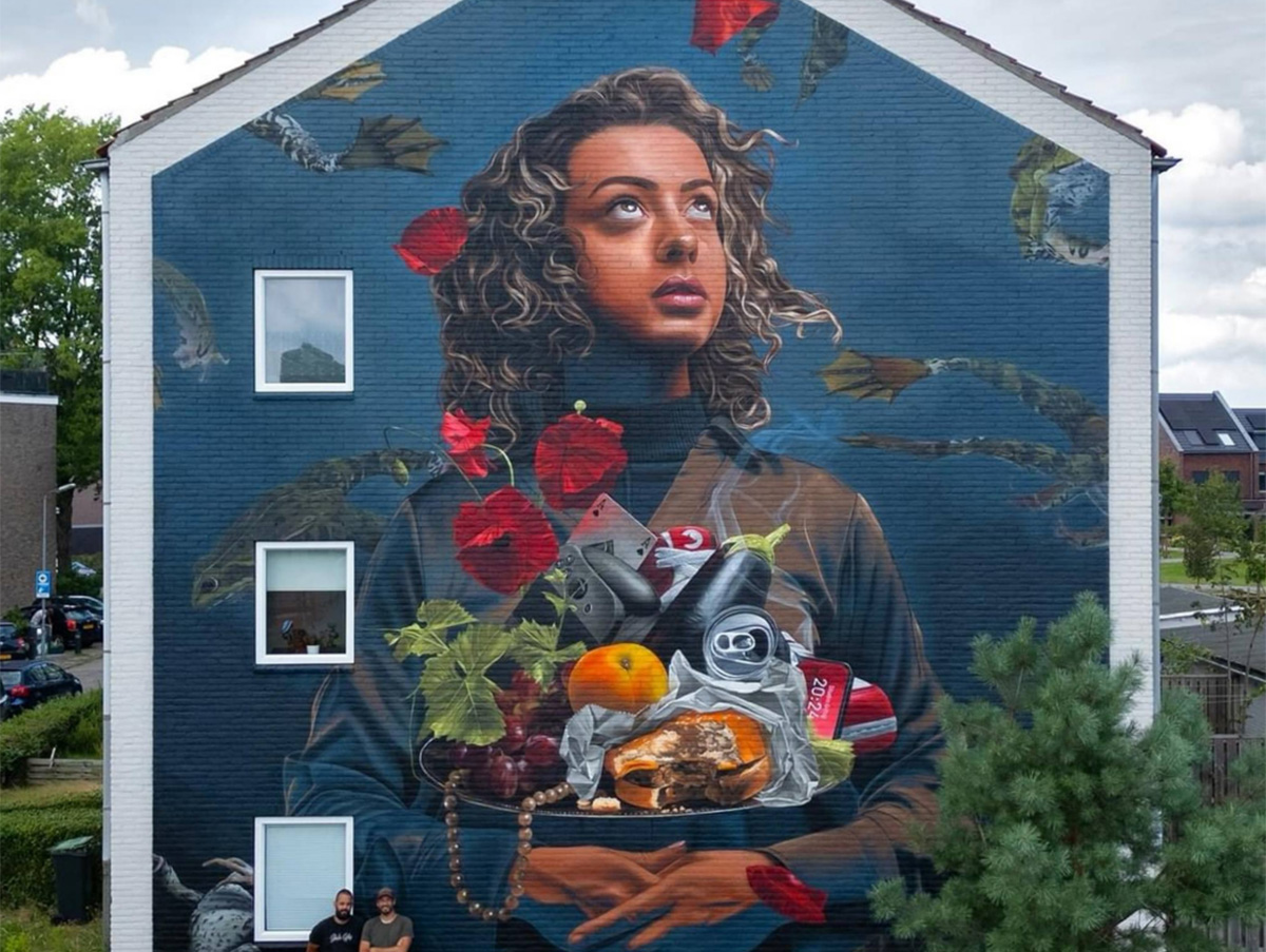 «Studio Giftig» – дуэт художников из Нидерландов Нильса ван Свемена (Niels van Swaemen) и Каспара ван Лика (Kaspar van Leek). Они познакомились в 2007 году и разработали общий стиль живописи, близкий к сюрреализму. Их творческие фантазии с успехом воплощаются не только в виде эффектных уличных муралов, но и в формате традиционных картин. Ребята много работают по всему миру, а композиции дуэта занимают призовые места на фестивалях стрит-арта. Два года назад я писал об их замечательной фреске «Весна в Белфасте», выполненной для фестиваля «Hit the North». Подробнее с творчеством художников вы можете познакомиться на сайте: studiogiftig.nl.