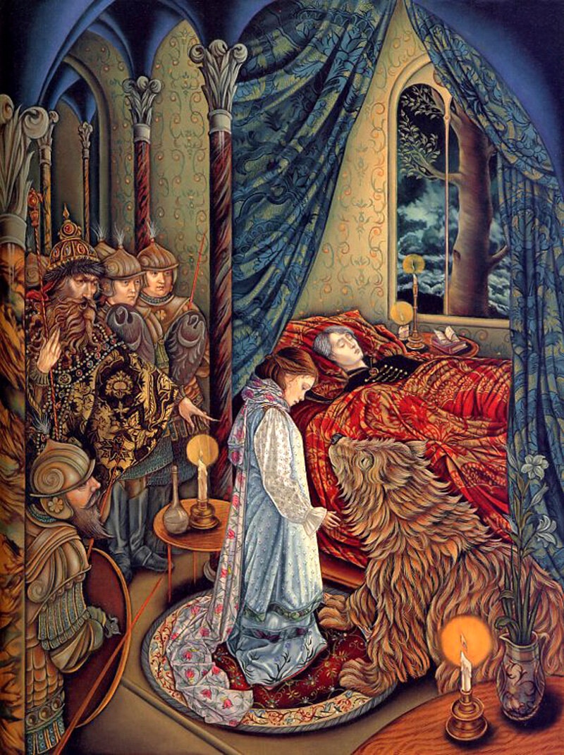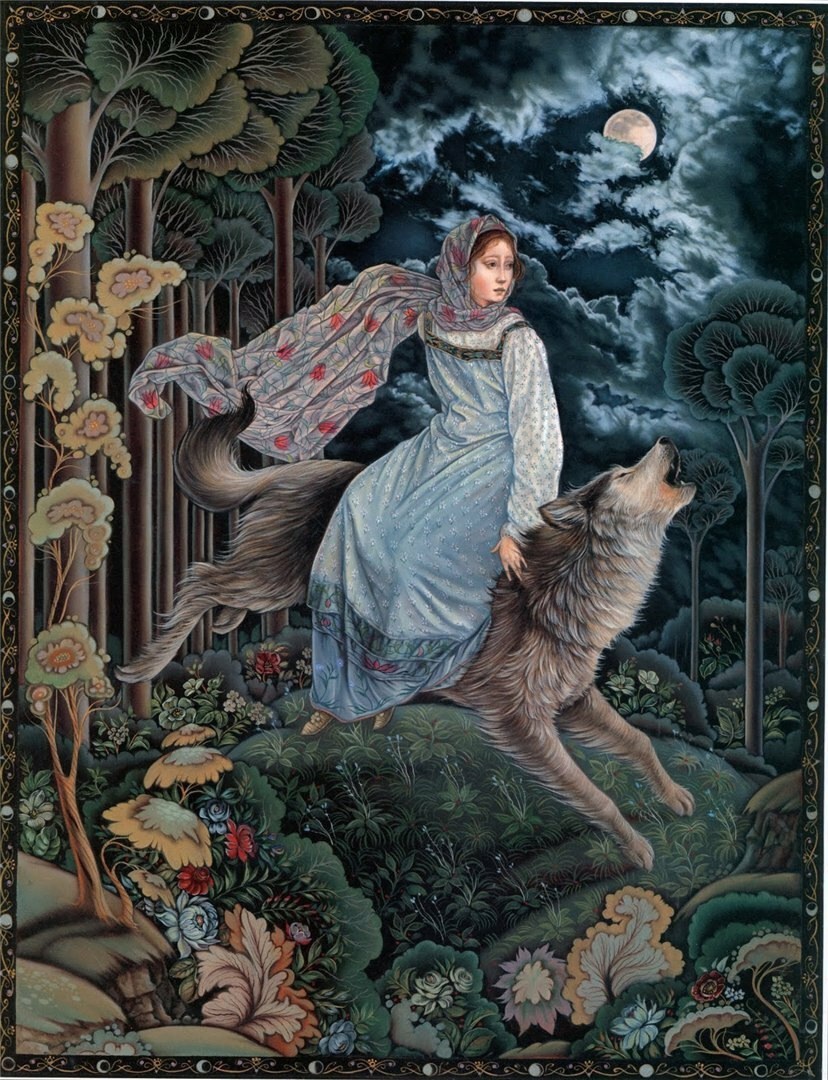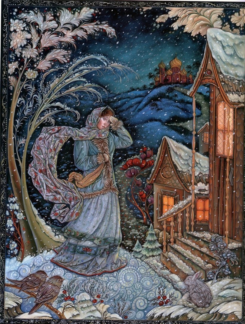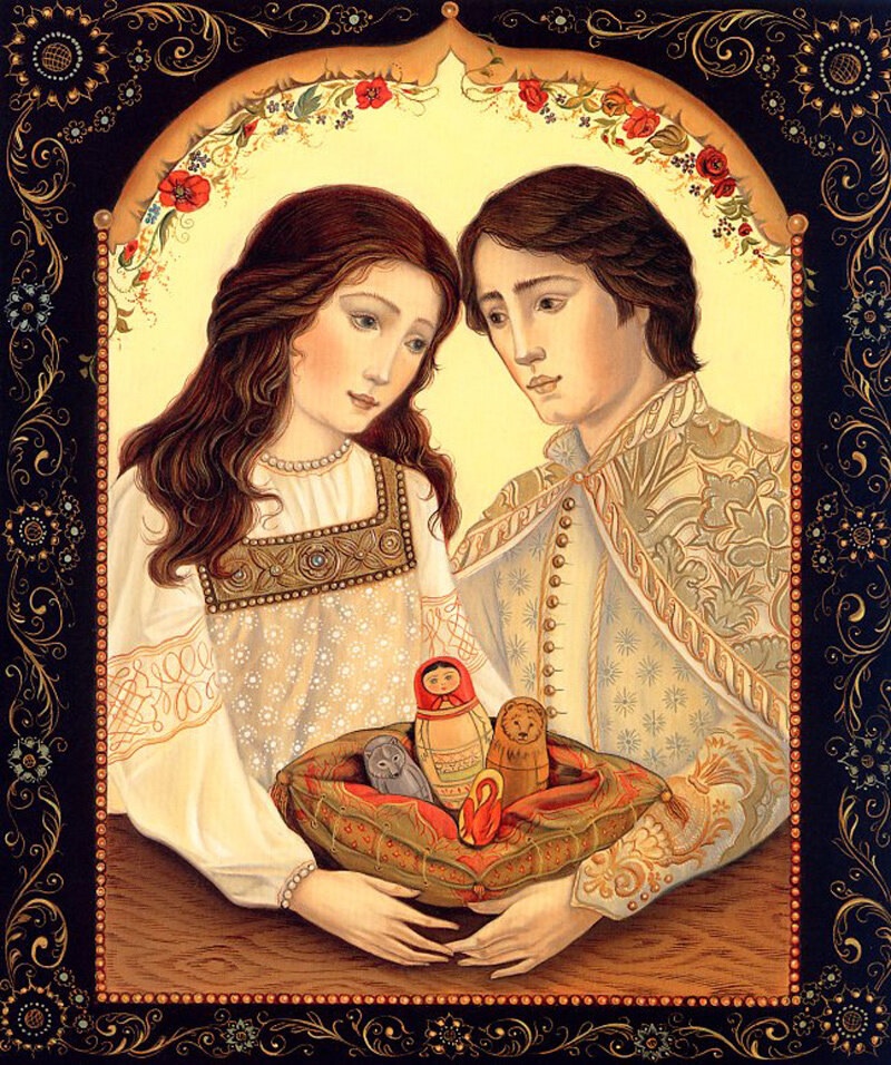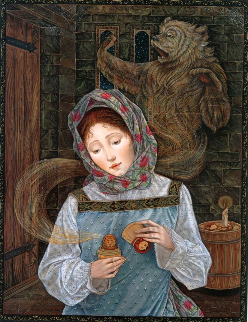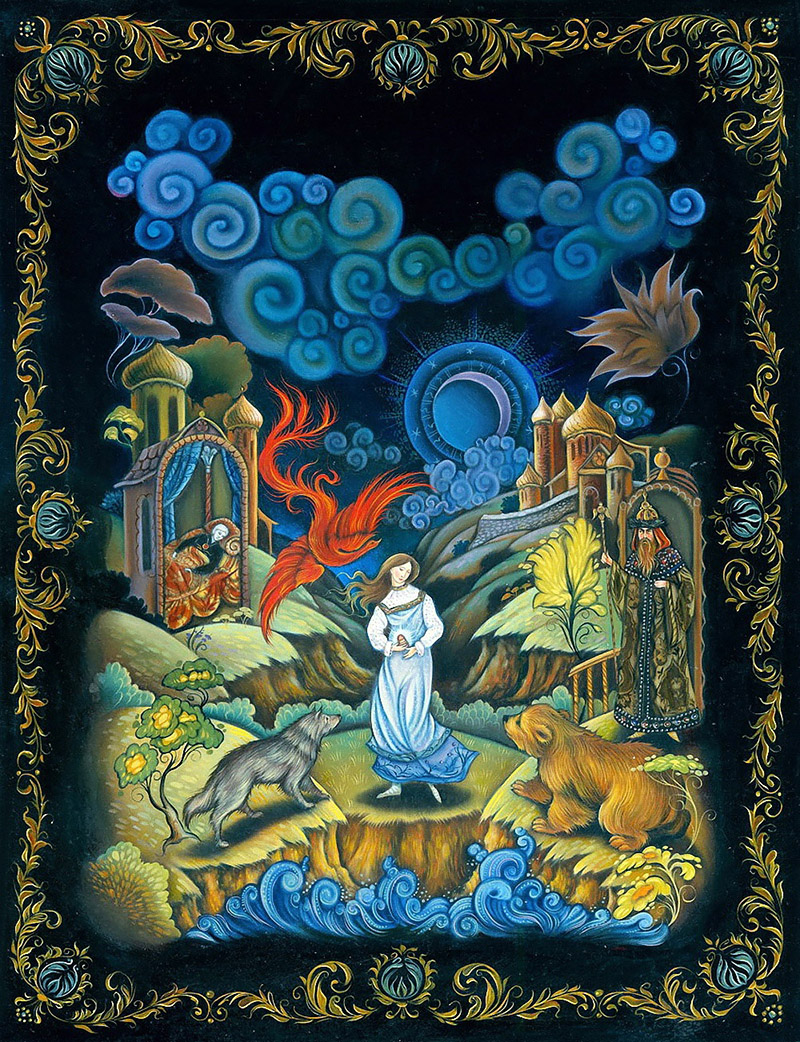 А вот рисунки к «Волшебной матрешке» создавала профессор кафедры искусств Калифорнийского государственного университета в Нортридже Лорел Лонг (Laurel Long). Она далеко не новичок в мире иллюстрации, оформила много детских изданий, включая «Ганса Бринкера» Брюса Ковилла и «Леди и лев» братьев Гримм. За книгу «Самое могущественное сердце» Линн Каллен художница была награждена Золотой медалью Общества иллюстраторов, а ее работы для «Двенадцати дней Рождества» даже были опубликованы в «The New York Times Book Review». Яркий и изысканный стиль Лорел Лонг буквально запестрел в «Волшебной матрешке» традиционными русскими символами. На ее рисунках ожили персонажи сказок нашего детства: волк, медведь, жар-птица, легко узнаются узоры и национальные костюмы. Лорел призналась, что для лучшей адаптации материала она долго изучала палехскую роспись. В целом ее работа не вызывает серьезных нареканий, и на меня произвела благоприятное впечатление. С другими аспектами творчества Лорел Лонг вы можете познакомиться на официальном сайте художницы. Все изображения: © Laurel Long.