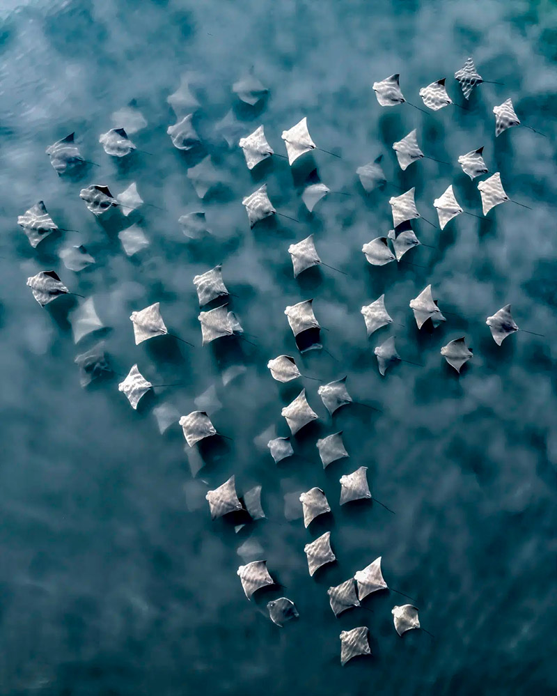 «Концерт» Джоанны Стайдл, США. Съемка с дрона небольшой стаи скатов-корононосов, взбивающих по пути песок.
