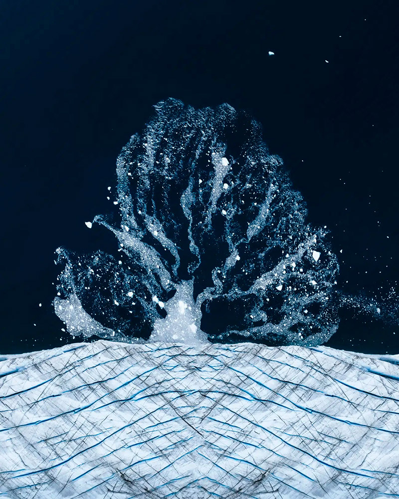 «Ледяное дерево» Тэйлора Стоуна, США. Воздушная перспектива откола ледника открывает неожиданный органический рисунок в воде.