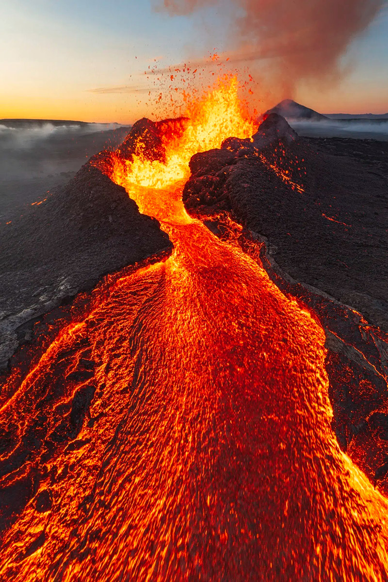 «Новая Земля» Майка Мезёла II, США. Спустя почти сутки после начала извержения вулкана Литли-Хрутур в Исландии 9 июля 2023 года, эта трехснимковая панорама демонстрирует недавно образовавшийся шлаковый конус и связанную с ним лавовую реку.