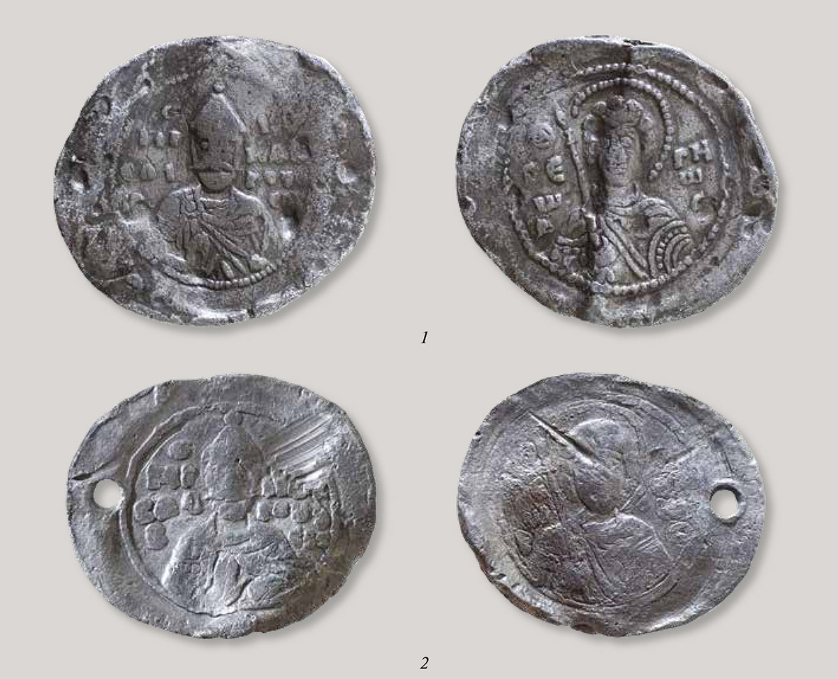 На фото: вислые свинцовые печати Ярослава Владимировича Мудрого. 1: Великий Новгород, Троицкий раскоп, находка 1994 года. 2: Киевская область, находка 2008 года. Новгородский государственный музей-заповедник. Фото: © Е. В. Гордюшенков.
