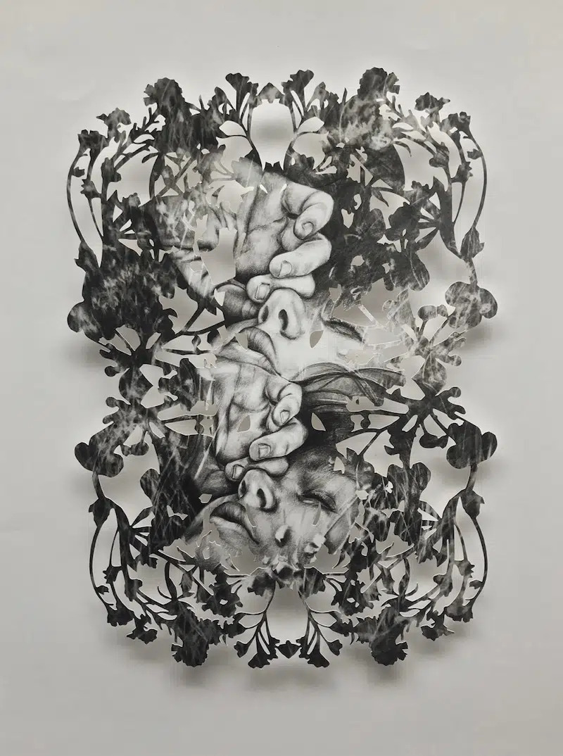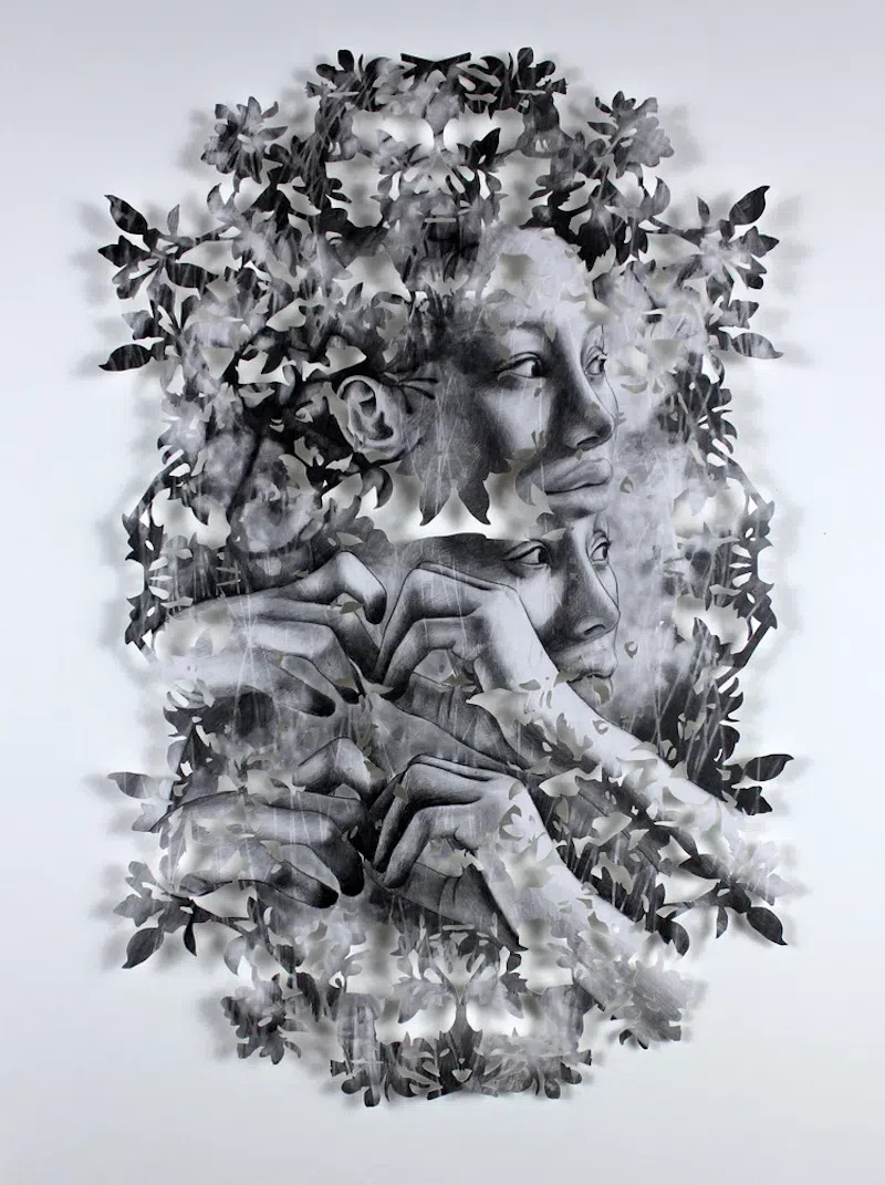 Бумага по своей природе хрупка, и художница использует это качество, чтобы передать ощущение уязвимости. Зритель видит лишь части портрета, словно калейдоскоп образов, мелькающий в памяти. Лица и человеческие фигуры разбавлены вырезанными растительными элементами, что придает ее работам удивительный эффект двойной экспозиции.
